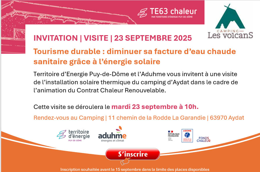 Territoire d’Energie Puy-de-Dôme et l’Aduhme vous invitent à une visite de l’installation solaire thermique du camping d’Aydat dans le cadre de l’animation du Contrat Chaleur Renouvelable.