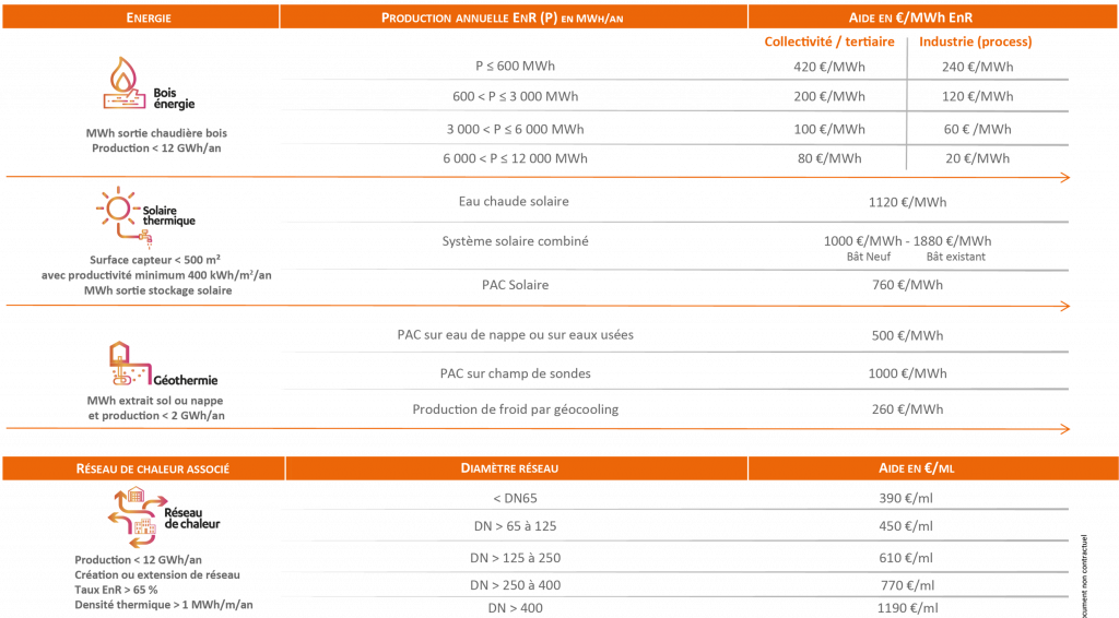 Cette contractualisation entre l’agence de la transition écologique et une autre structure comme l’EPCI ou le Syndicat d’Énergie est basée sur la réalisation d’un objectif de production annuelle de chaleur renouvelable et la mise à disposition par cette première d’une enveloppe budgétaire permettant de financer l’animation territoriale, la réalisation d’études et des investissements ; la gestion de ce fonds est assurée par le territoire engagé par convention de mandat.