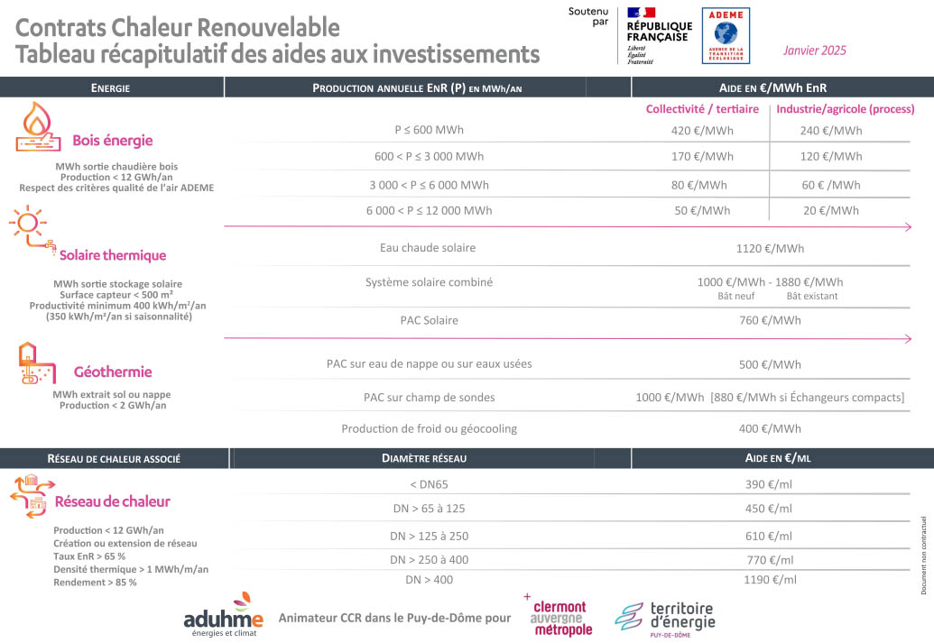 Le Contrat Chaleur Renouvelable (CCR) est un dispositif déployé par l’ADEME en lien avec des territoires et qui permet à tous les porteurs de projets ayant un numéro de SIRET (hors particuliers) d’accéder aux aides du Fonds Chaleur pour le financement d’études et d’investissements liés à la production de chaleur renouvelable : solaire thermique, bois-énergie, PAC géothermique et réseaux de chaleur associés. La gestion de ce fonds est assurée par le territoire engagé par convention de mandat. Cette contractualisation avec l’ADEME est basée sur la réalisation de divers objectifs dont un objectif de production de chaleur renouvelable et la mise à disposition par cette première d’une enveloppe budgétaire permettant de financer la réalisation d’études et des investissements, ainsi que l’animation territoriale.